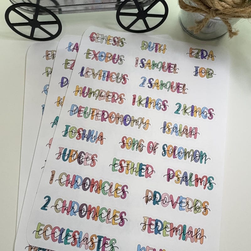 🖋️📖 Add a Touch of Handmade Charm to Your Scripture Study! These lovingly hand-lettered stickers celebrate the beauty of imperfection, featuring the Books of the Bible in a whimsical and inviting style. Printed on high-quality repositionable paper, they’re perfect for decorating your Bible margins, prayer journals, or planners without causing damage.
