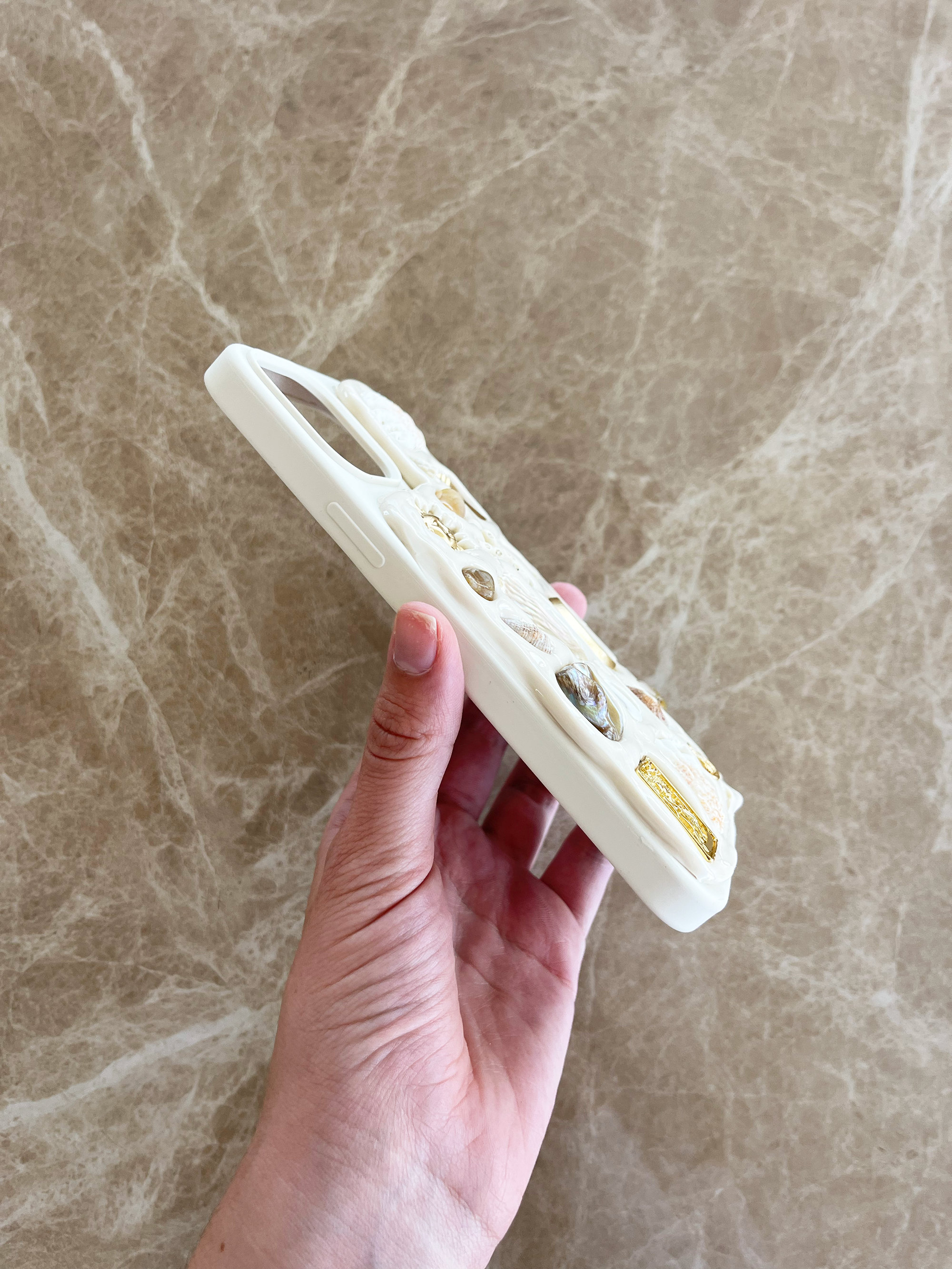 • Each case is one-of-a-kind and variation from the photo should be expected. Your case could include extra shells, shards, beads, stones, or freshwater pearls to fill in gaps in the mosaic.